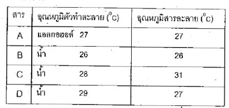 #1. การทดลองการละลายน้ำและแอลกอฮอล์ของสาร ตัวอย่าง A,B, C และ D มีผลต่ออุณหภูมิดังแสดงในตาราง การละลายของสารตัวอย่างชนิดใดมีการเปลี่ยนแปลงพลังงานแบบดูดความร้อน