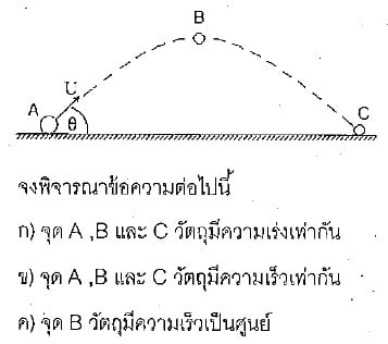 #7. จากรูปเป็นการเคลื่อนที่ของวัตถุชิ้นหนึ่ง ซึ่งถูกยิงออกไป ด้วยความเร็วต้น U ในทิศหางทำมุม θ กับแนวระดับ ข้อความที่ถูกต้อง คือข้อใด